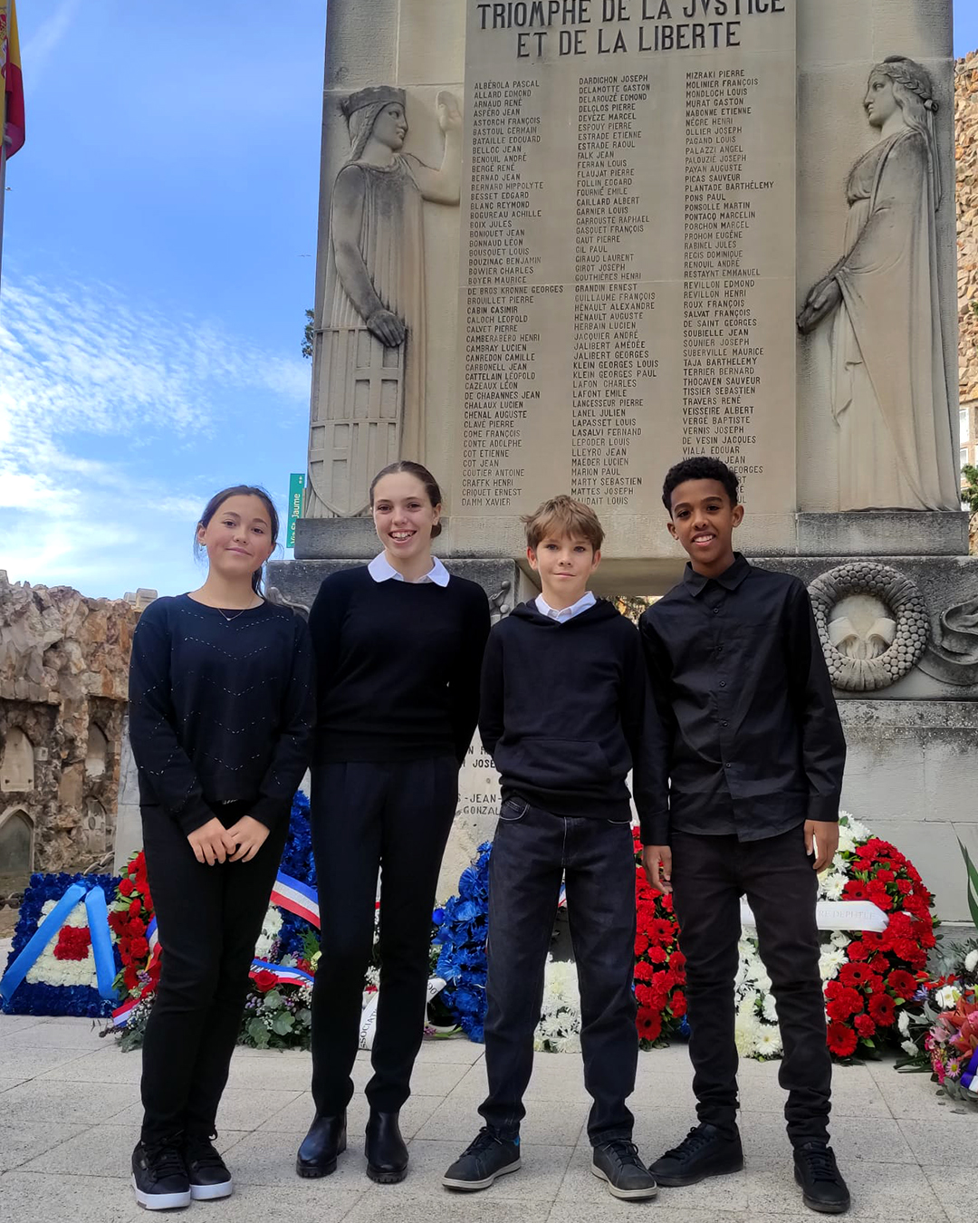 Noémi, Théo, Emma et Nolan, élèves de 4ème, ont représenté notre établissement à la cérémonie de la commémoration de l’Armistice du 11 novembre 1918 et du Centenaire du Panthéon des Français au cimetière de Montjuic à Barcelone.