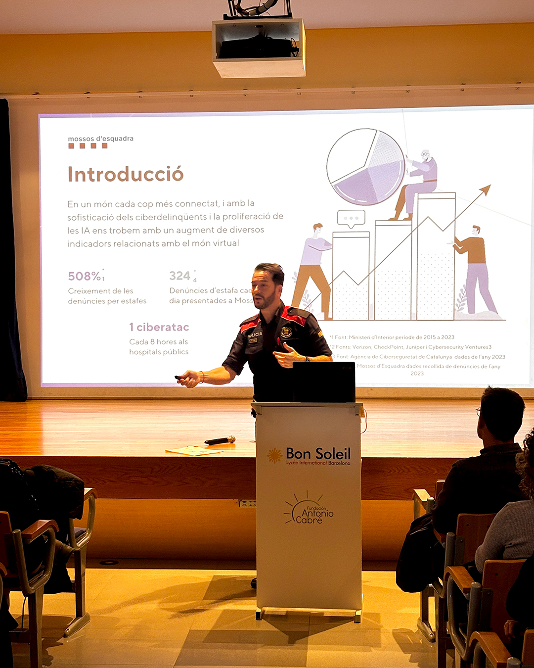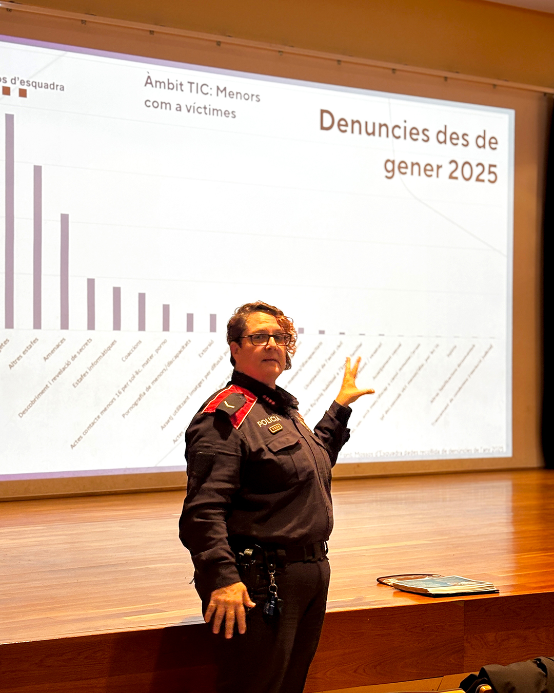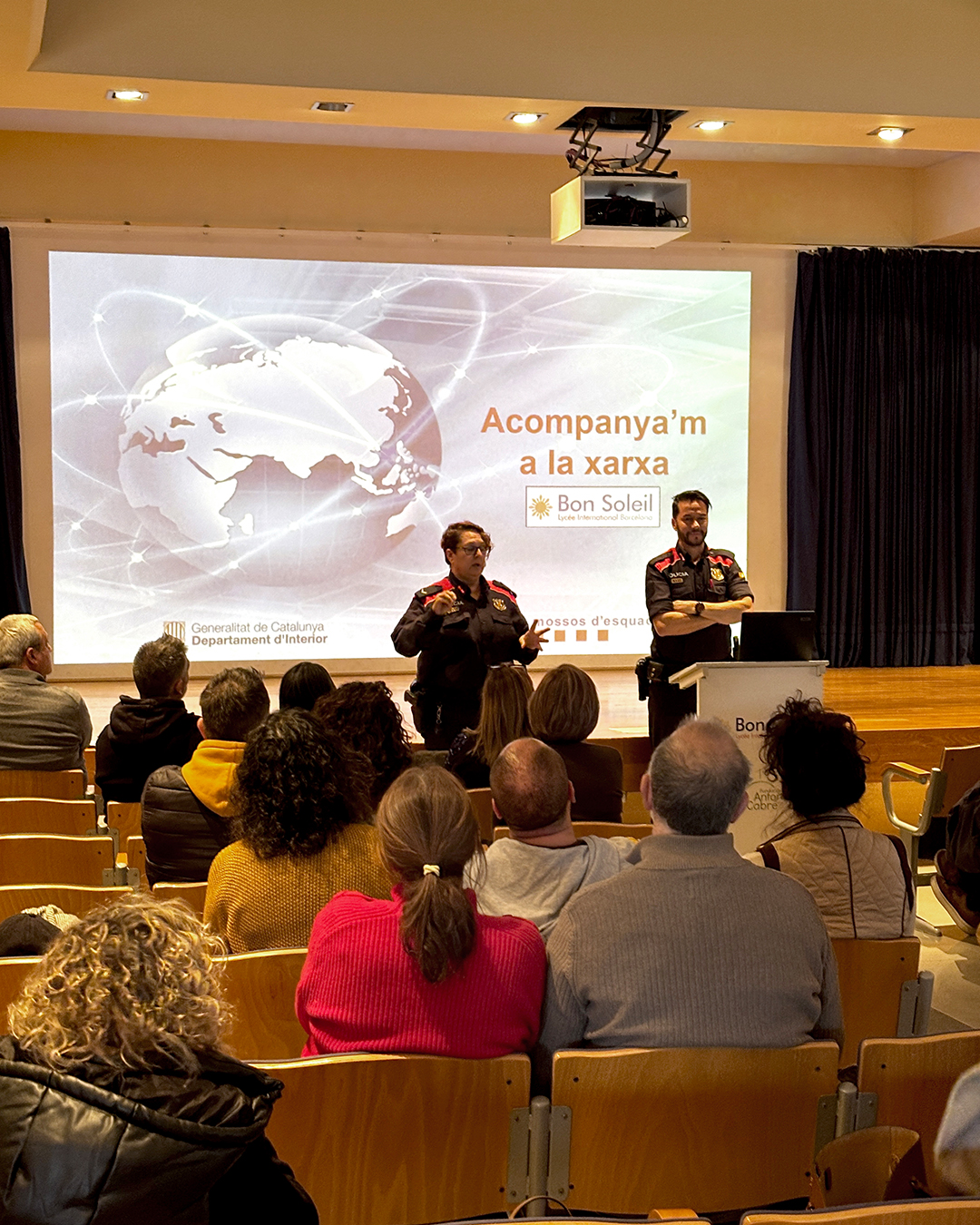 En el marco de nuestro compromiso con la seguridad y la educación digital, los Mossos d’Esquadra han impartido la conferencia “Acompanya’m a la xarxa”, dirigida a las familias. La sesión ofreció herramientas para acompañar a los hijos en un uso seguro y responsable de Internet y las redes sociales.